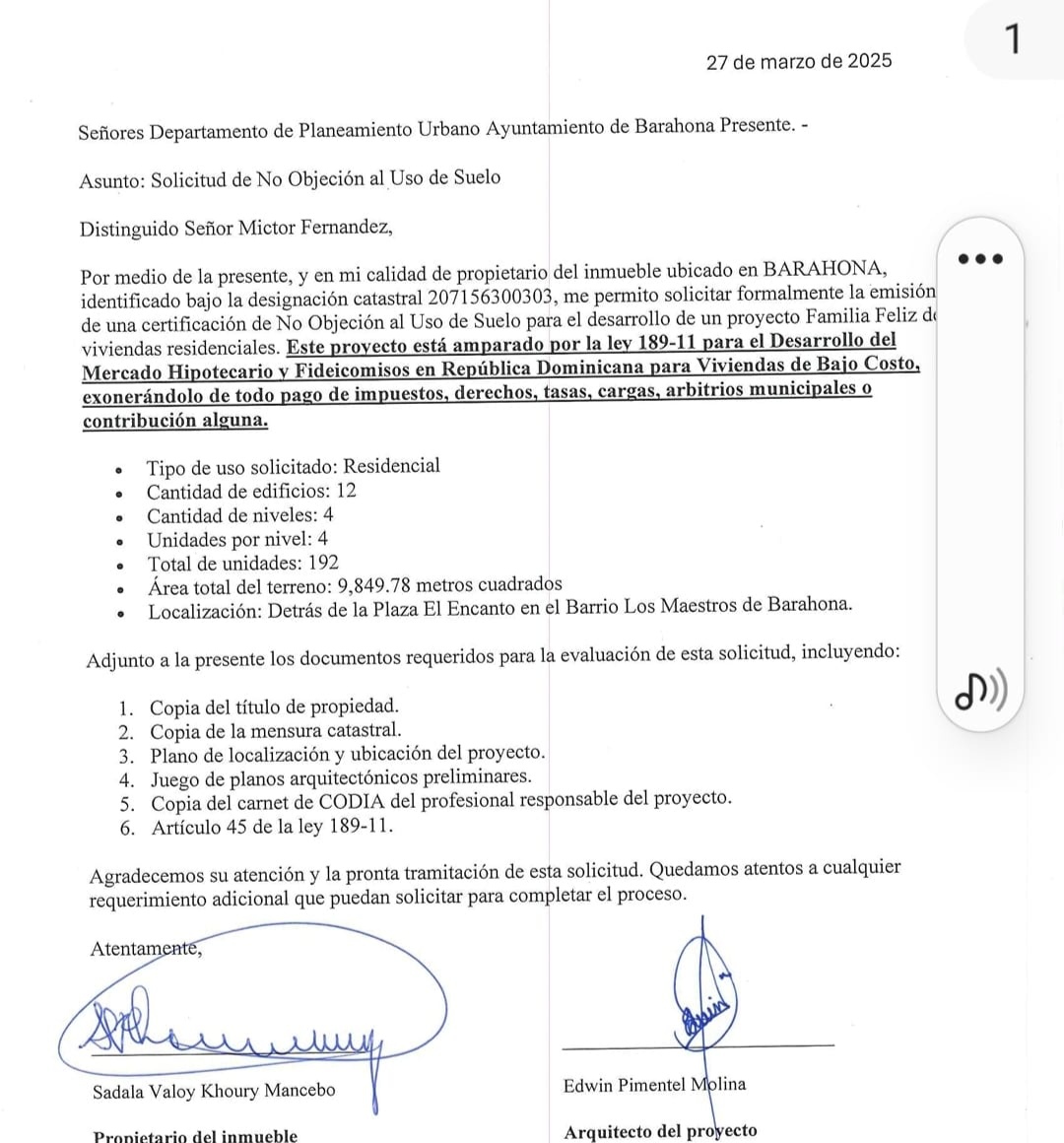 El pasado 27 de marzo ,el proyecto solicitó formalmente el Permiso de No Objeción de uso de suelo al departamento de Planeamiento urbano de la alcaldía del municipio de Barahona, que dirige el alcalde Mictor Fernández.
